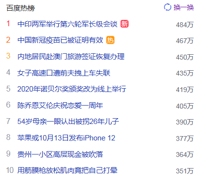 1.中印两军举行第六轮军长级会谈 猎头热点热度484万