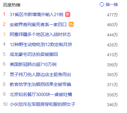 1. 31省区市新增境外输入21例 猎头热点热度477万