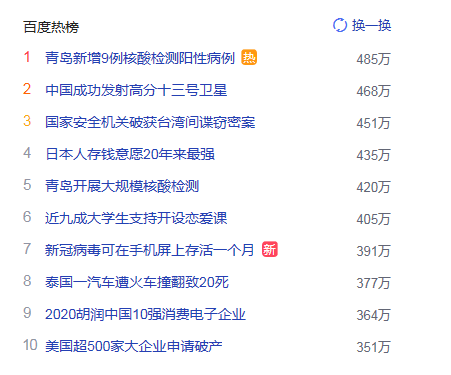 1. 青岛新增9例核酸检测阳性病例 猎头热点热度485万