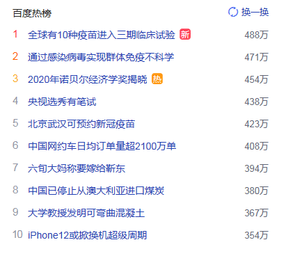 1. 全球有10种疫苗进入三期临床试验 猎头热点热度488万