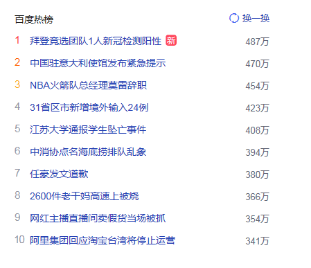 1. 拜登竞选团队1人新冠检测阳性 猎头热点热度487万