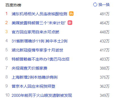 1. 浦东机场相关人员连夜核酸检测 猎头热度热点481万